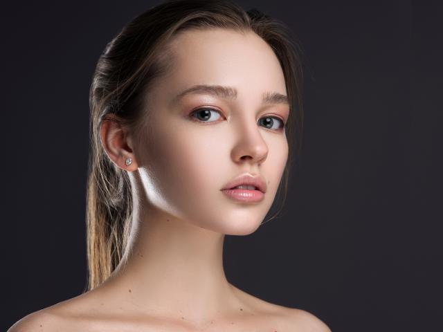 Обои Нежная настоящая девушка шатенка на сером фоне