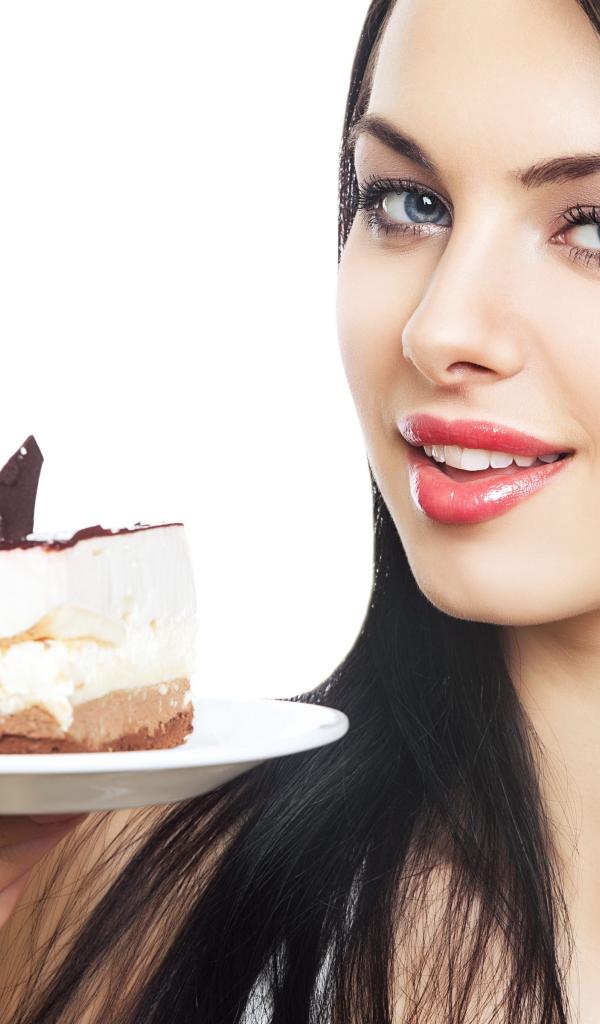 Обои Красивая брюнетка с куском торта на блюдце