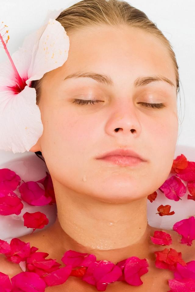 Обои Красивая девушка в ванной с лепестками розы