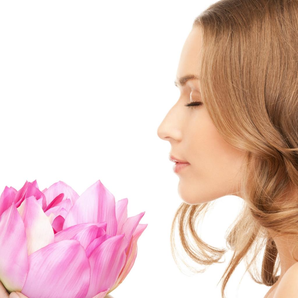 Обои Красивая девушка шатенка наслаждается ароматом лотоса