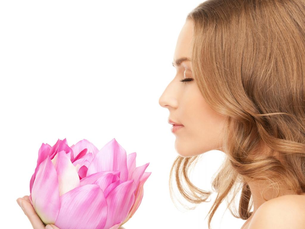 Обои Красивая девушка шатенка наслаждается ароматом лотоса