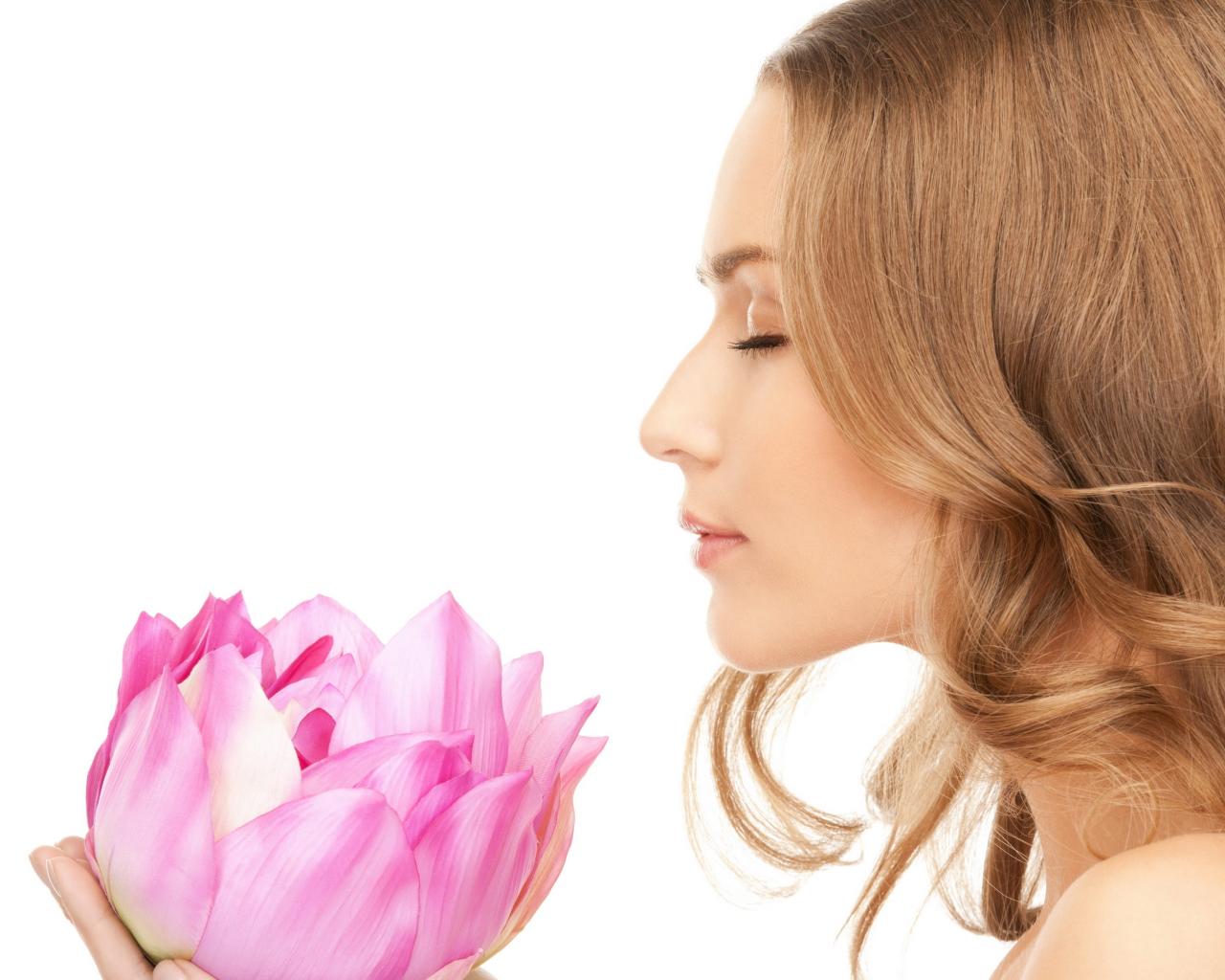 Обои Красивая девушка шатенка наслаждается ароматом лотоса