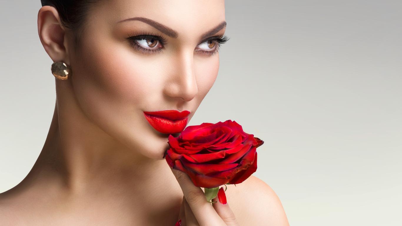 Обои Яркая стильная девушка с красной розой в руке