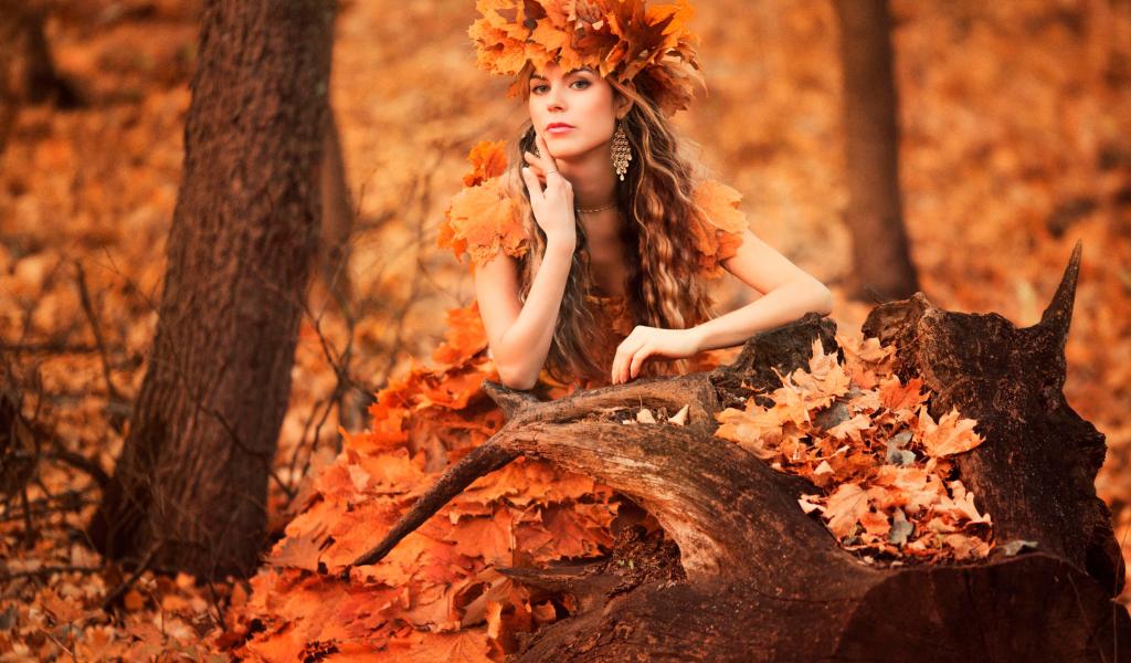 Обои Красивая девушка осень в костюме из желтых листьев