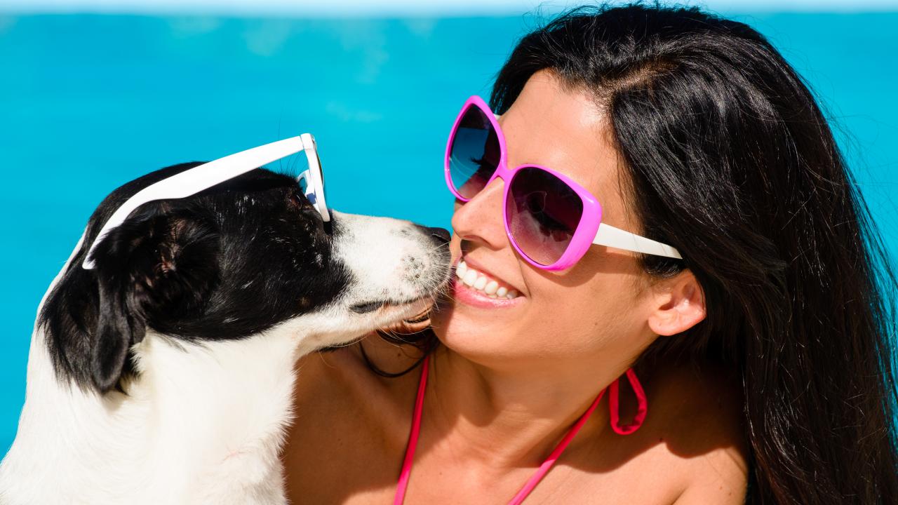 Обои Красивая улыбающаяся девушка в солнечных очках с собакой