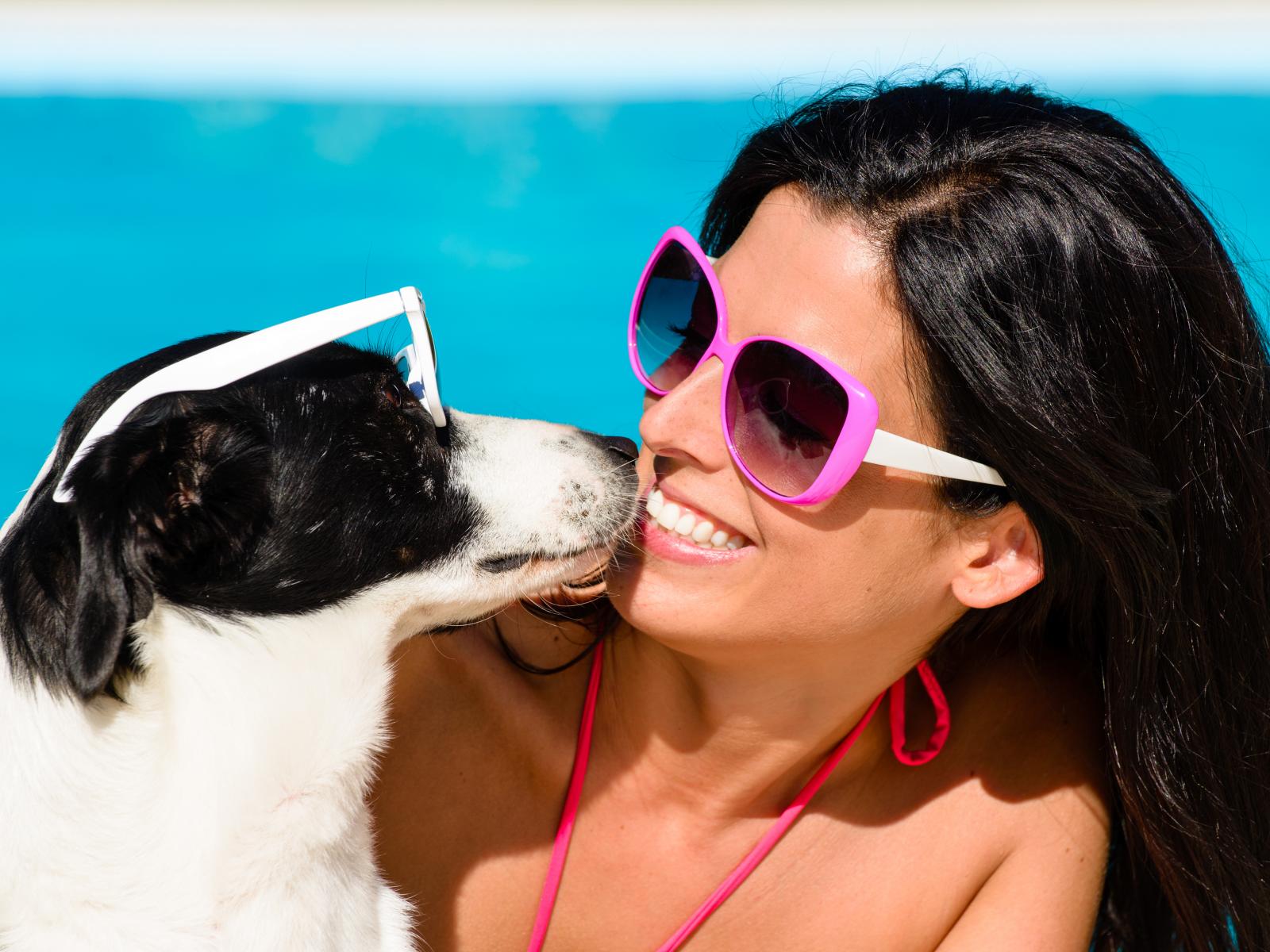 Обои Красивая улыбающаяся девушка в солнечных очках с собакой