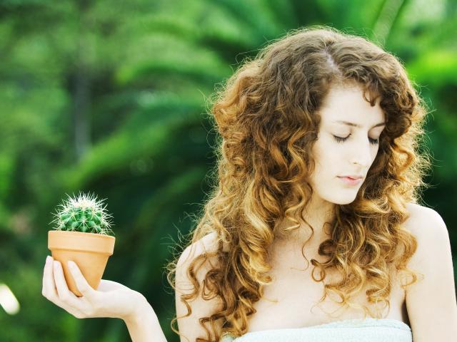 Обои Красивая девушка с закрытыми глазами с кактусом в руке