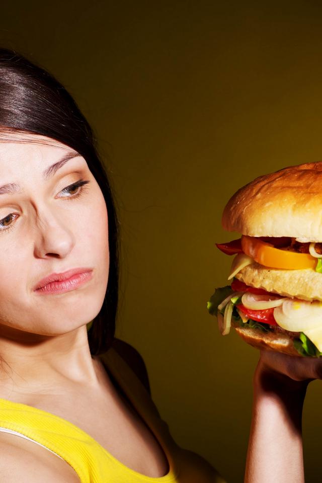 Обои Недовольная девушка с большим гамбургером в руках