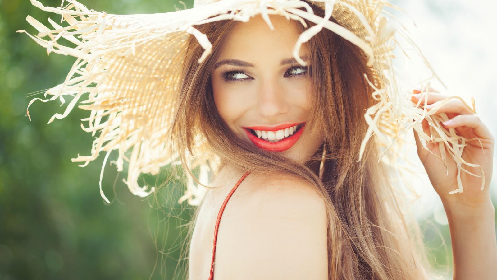 Обои Улыбающаяся девушка в соломенной шляпе летом