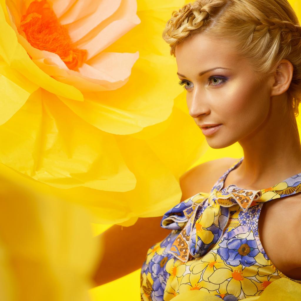 Обои Красивая девушка блондинка на фоне желтого цветка