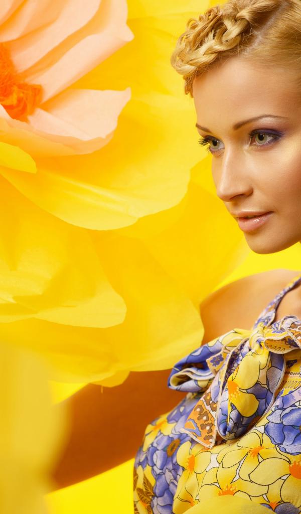 Обои Красивая девушка блондинка на фоне желтого цветка