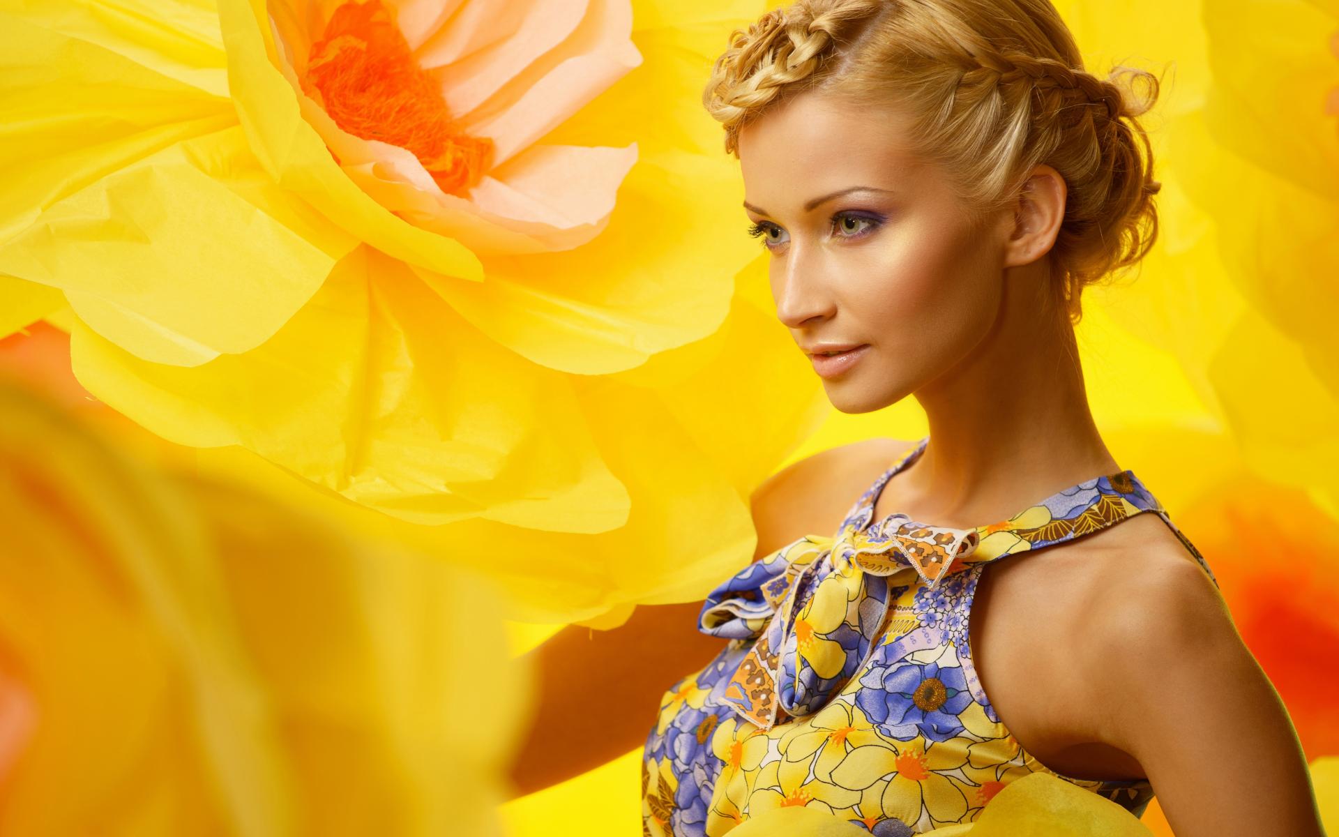 Обои Красивая девушка блондинка на фоне желтого цветка