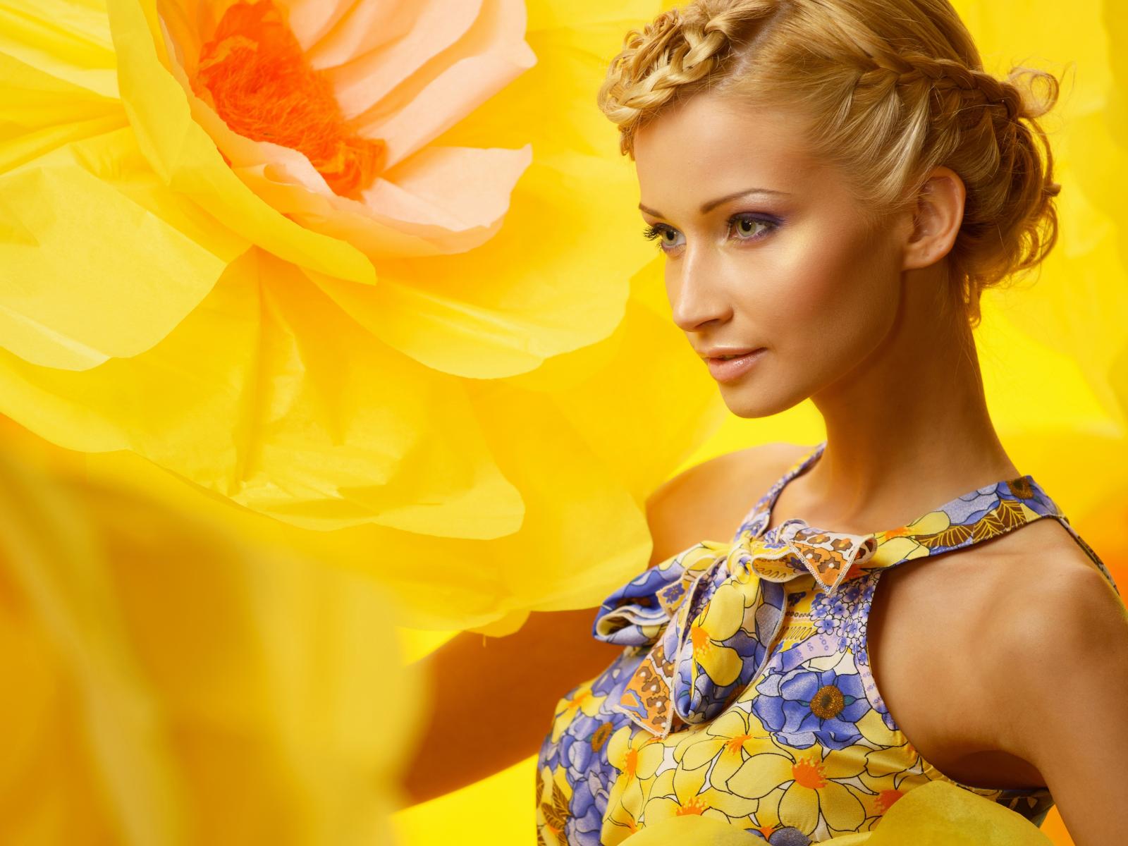 Обои Красивая девушка блондинка на фоне желтого цветка
