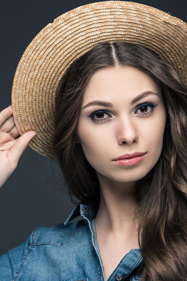 Обои Красивая девушка в соломенной шляпе на сером фоне