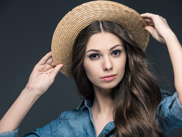 Обои Красивая девушка в соломенной шляпе на сером фоне
