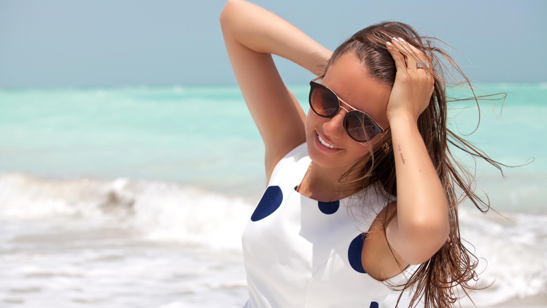 Обои Молодая шатенка в солнечных очках у моря