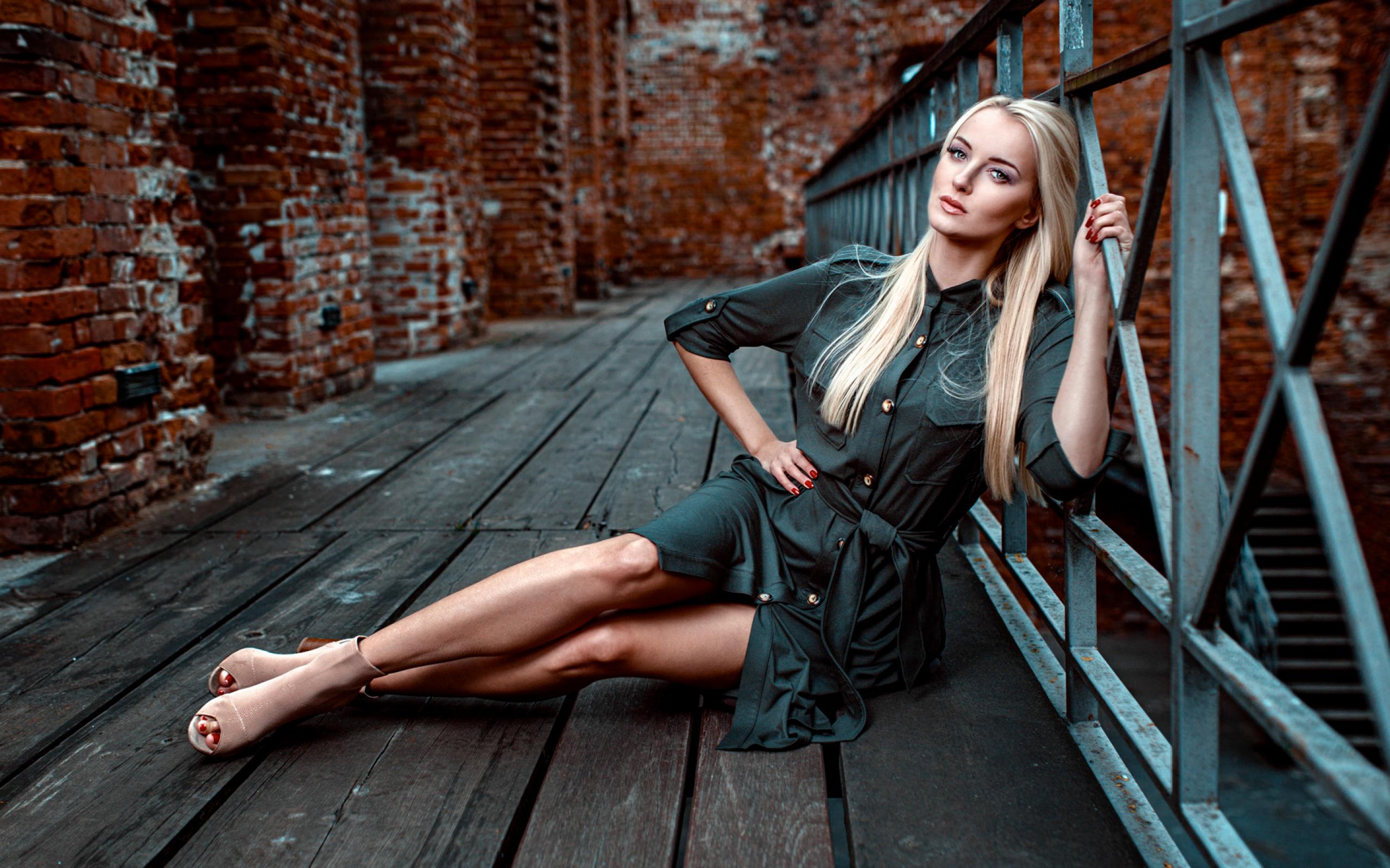 Обои Красивая девушка сидит на деревянном полу