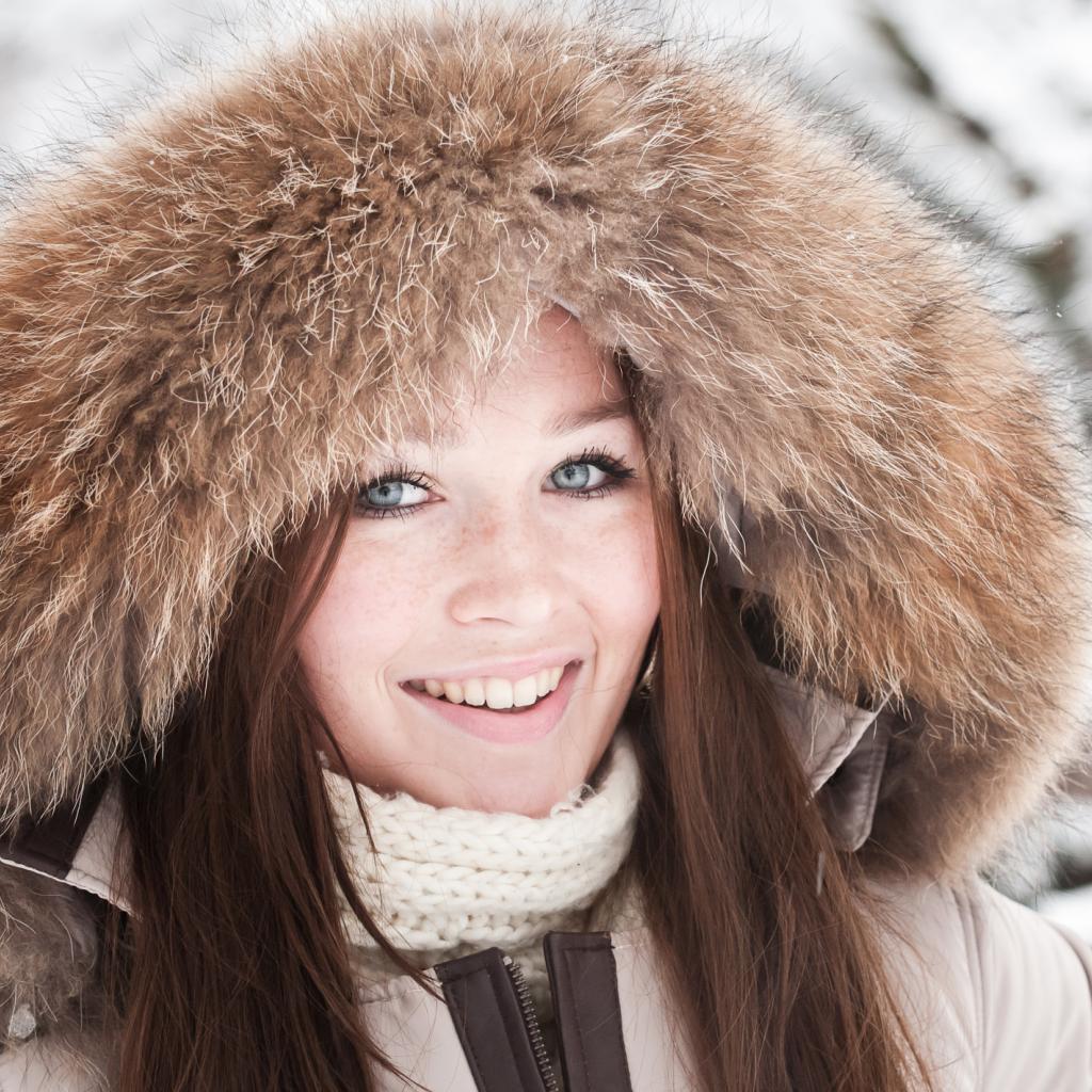 Обои Улыбающаяся голубоглазая девушка в капюшоне зимой
