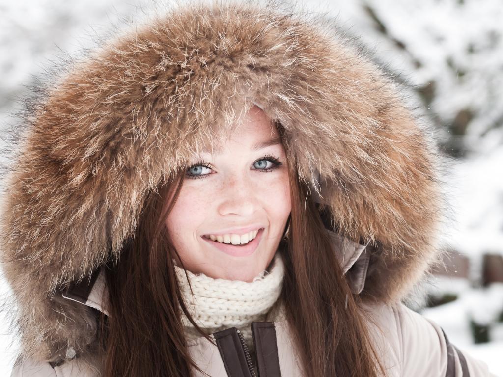 Обои Улыбающаяся голубоглазая девушка в капюшоне зимой