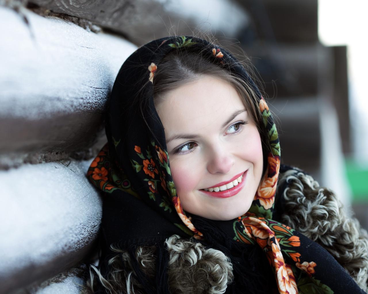 Обои Красивая русская девушка в платке зимой
