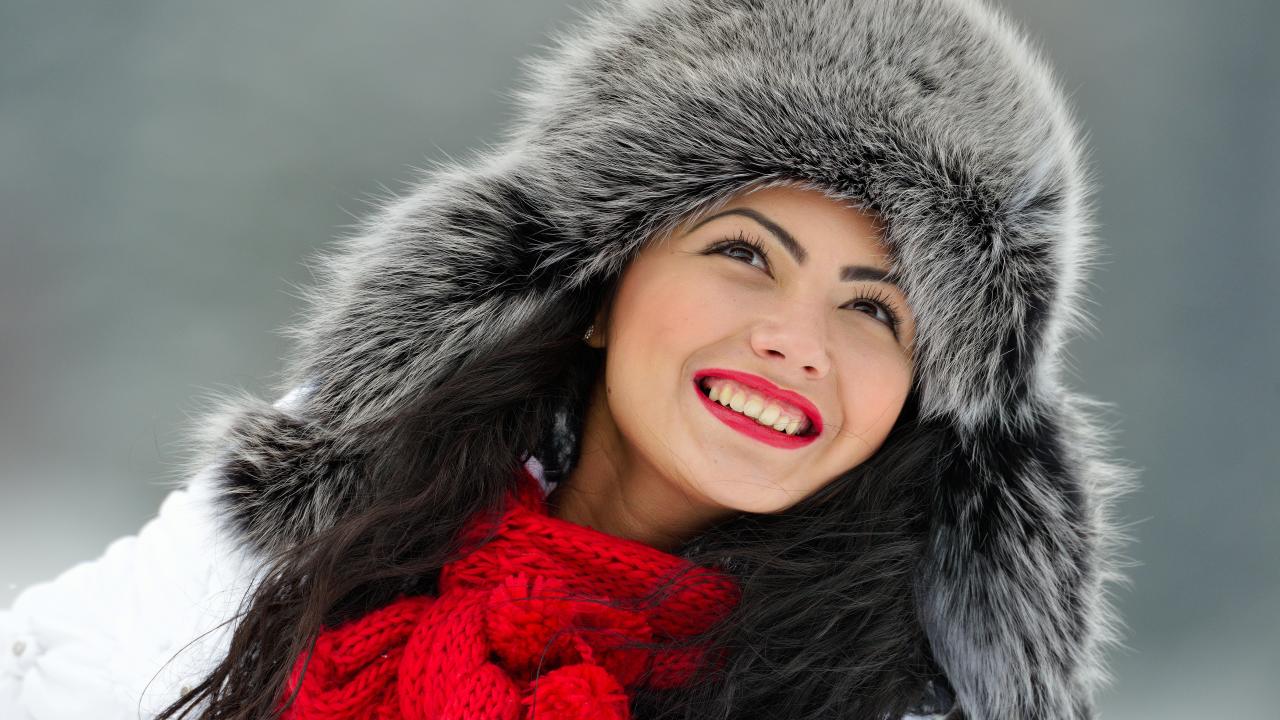 Обои Красивая улыбающаяся брюнетка в теплой зимней шапке