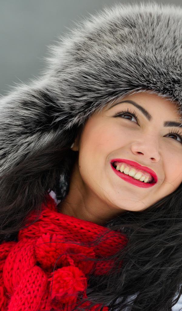 Обои Красивая улыбающаяся брюнетка в теплой зимней шапке