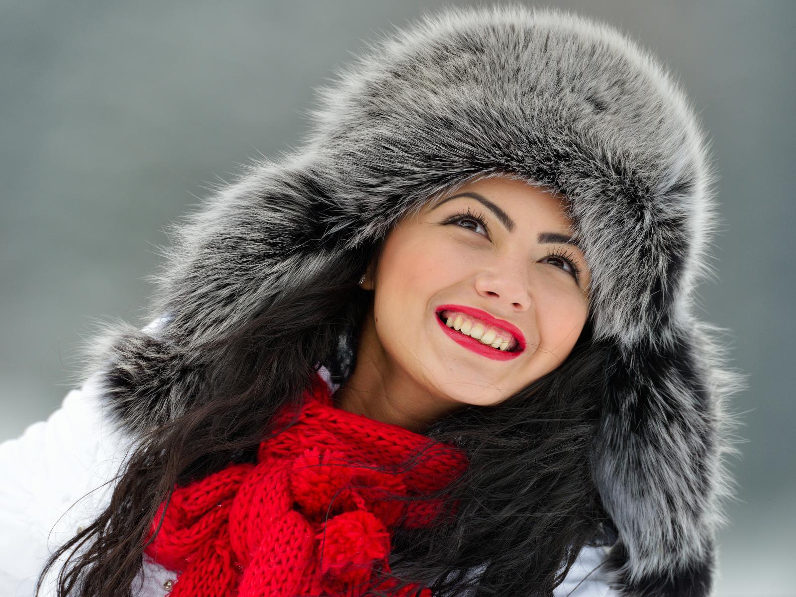 Обои Красивая улыбающаяся брюнетка в теплой зимней шапке
