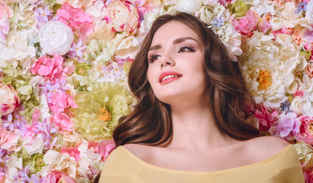 Обои Красивая нежная девушка шатенка с венком на голове на фоне цветов