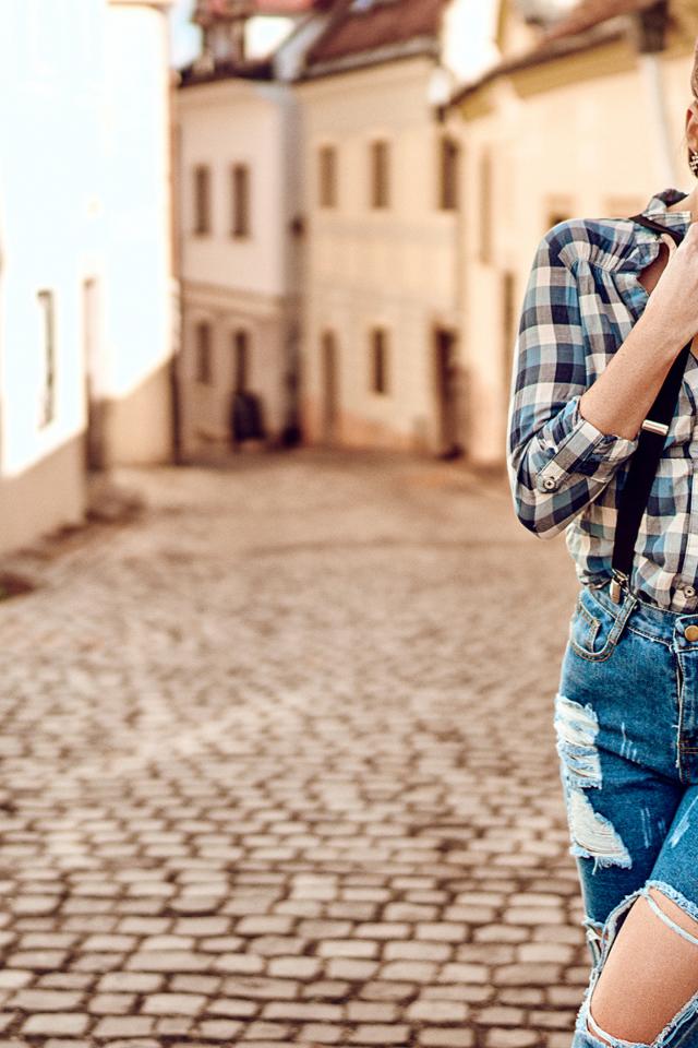 Обои Молодая девушка в рваных джинсах, рубашке и кепке