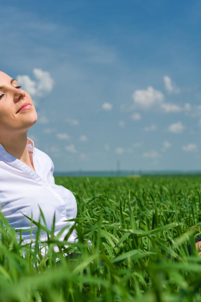 Обои Красивая девушка нежится на солнце в зеленой траве