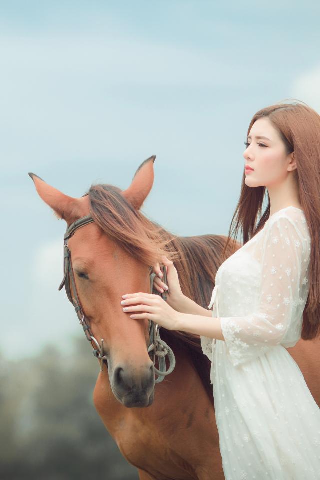 Обои Молодая азиатка в белом платье с лошадью