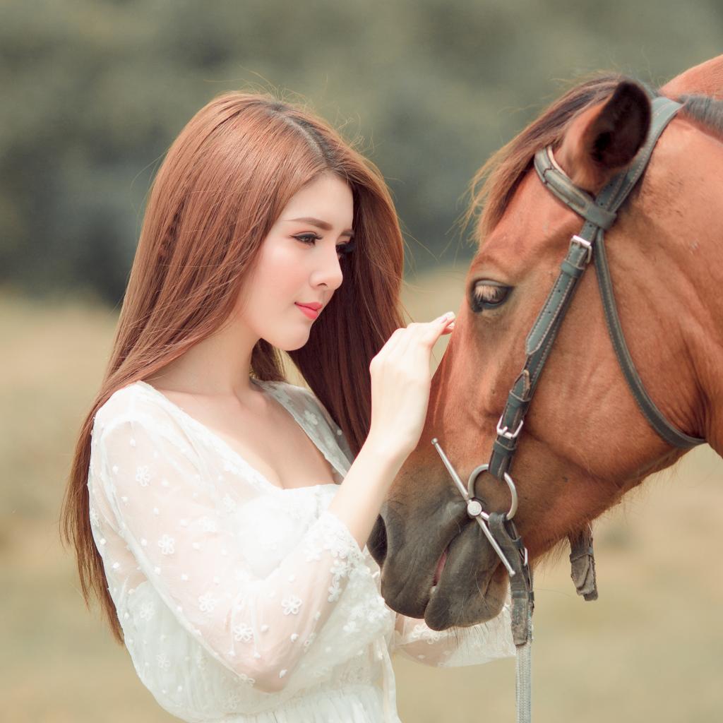 Обои Красивая длинноволосая азиатка гладит лошадь