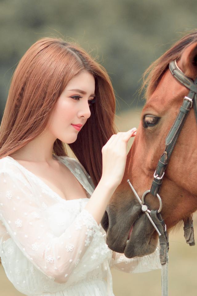 Обои Красивая длинноволосая азиатка гладит лошадь