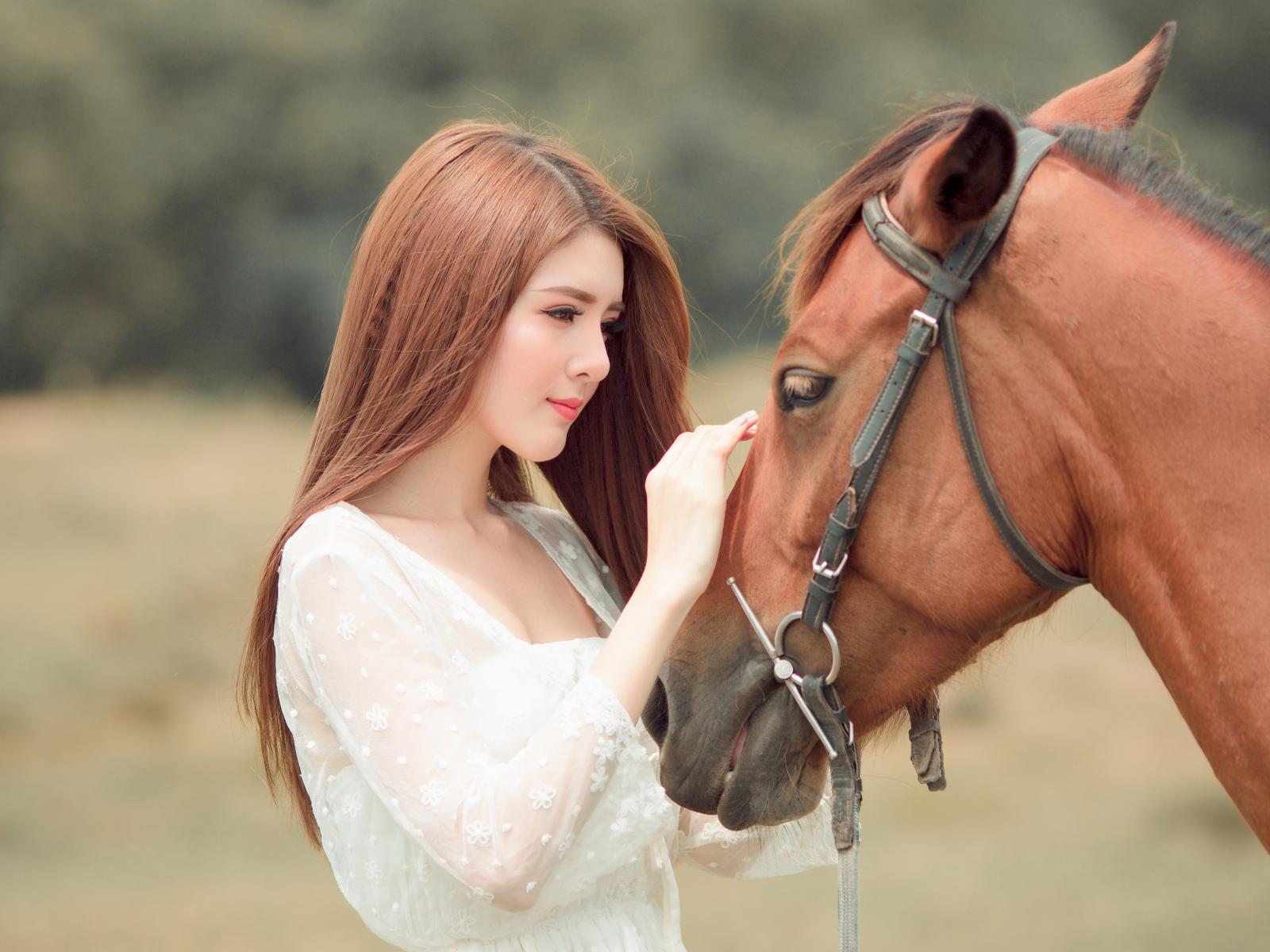 Обои Красивая длинноволосая азиатка гладит лошадь