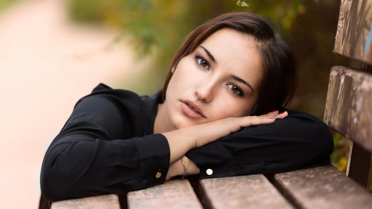 Обои Грустная кареглазая девушка лежит на деревянной лавке
