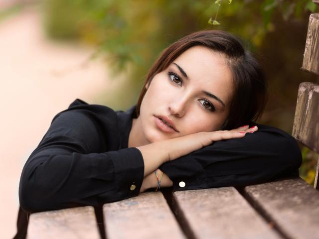 Обои Грустная кареглазая девушка лежит на деревянной лавке