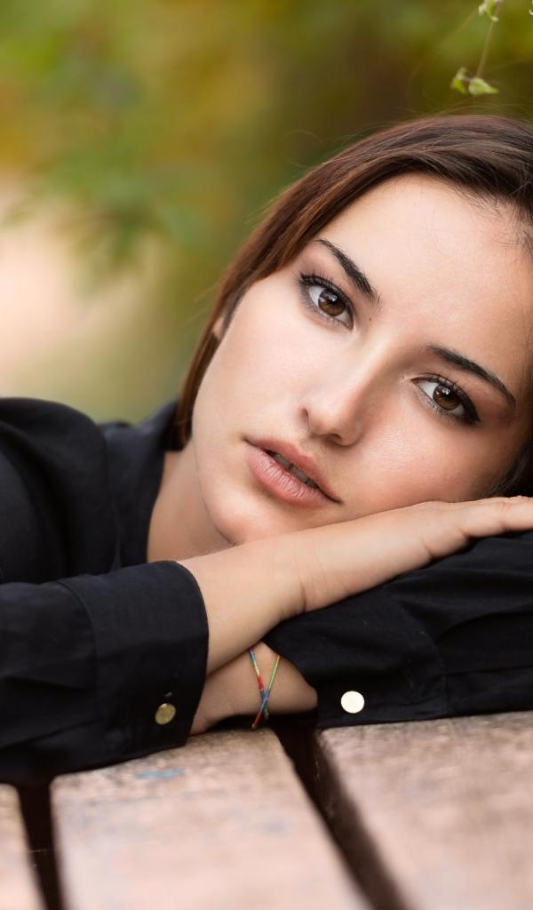 Обои Грустная кареглазая девушка лежит на деревянной лавке