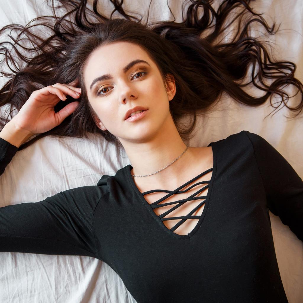 Обои Кареглазая девушка в черном лежит на кровати
