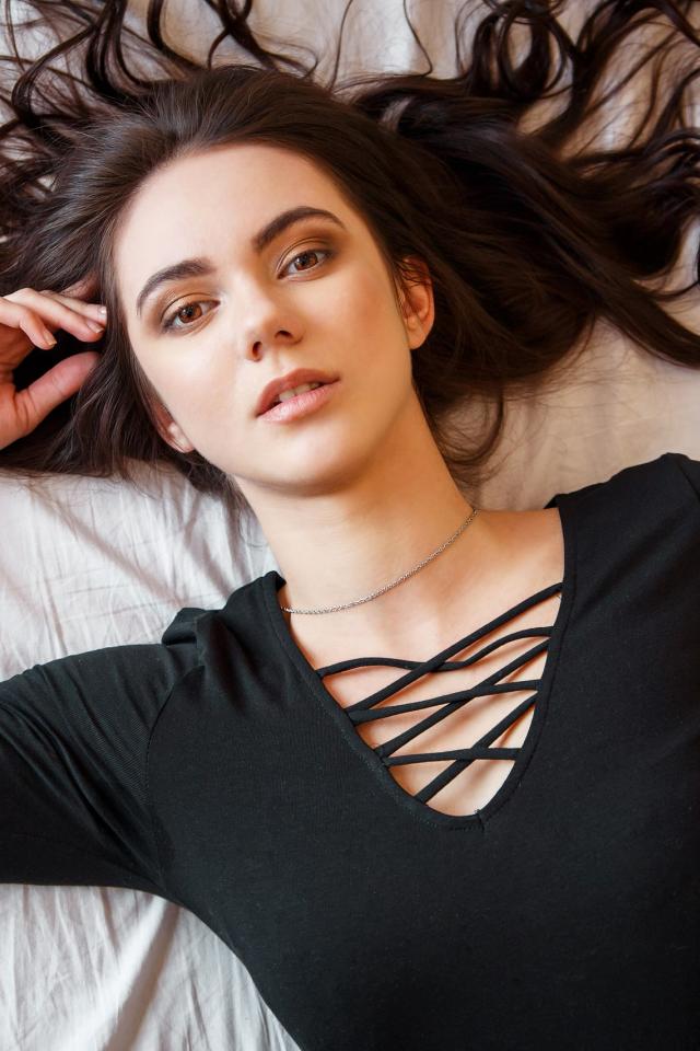 Обои Кареглазая девушка в черном лежит на кровати