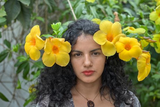 Обои Красивая брюнетка с большими желтыми цветами в волосах