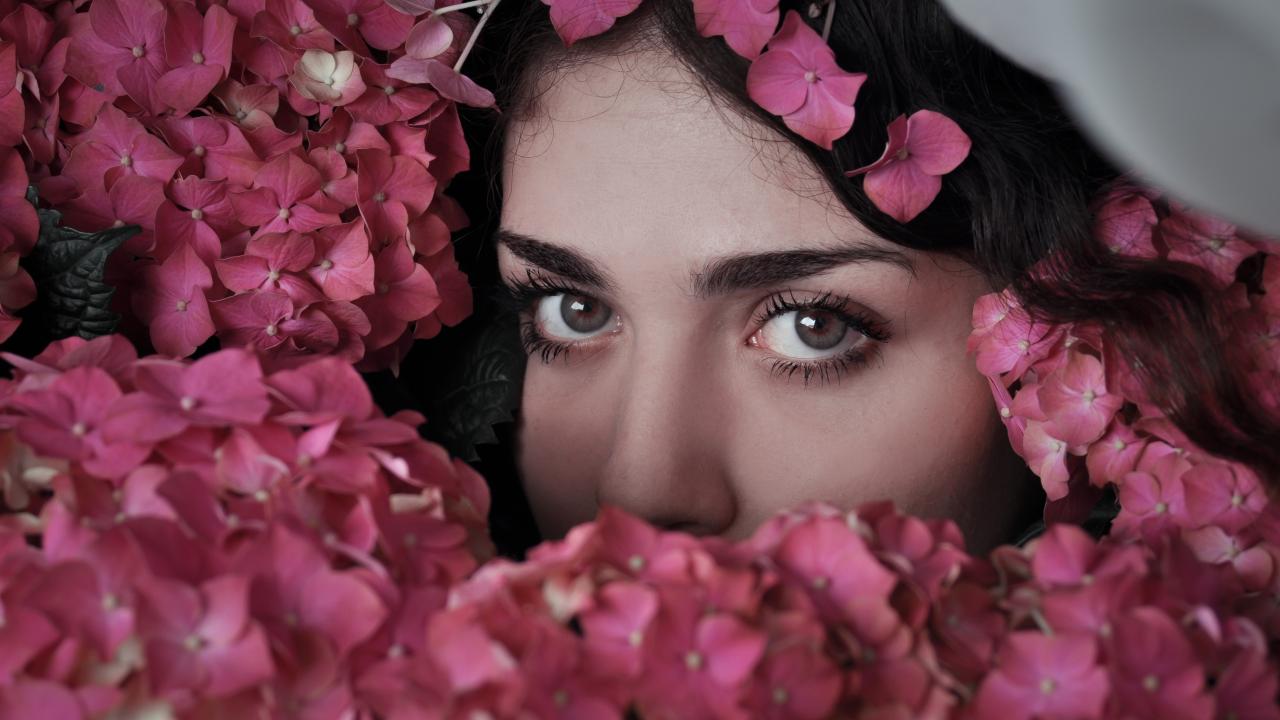 Обои Лицо девушки в розовых цветах гортензии