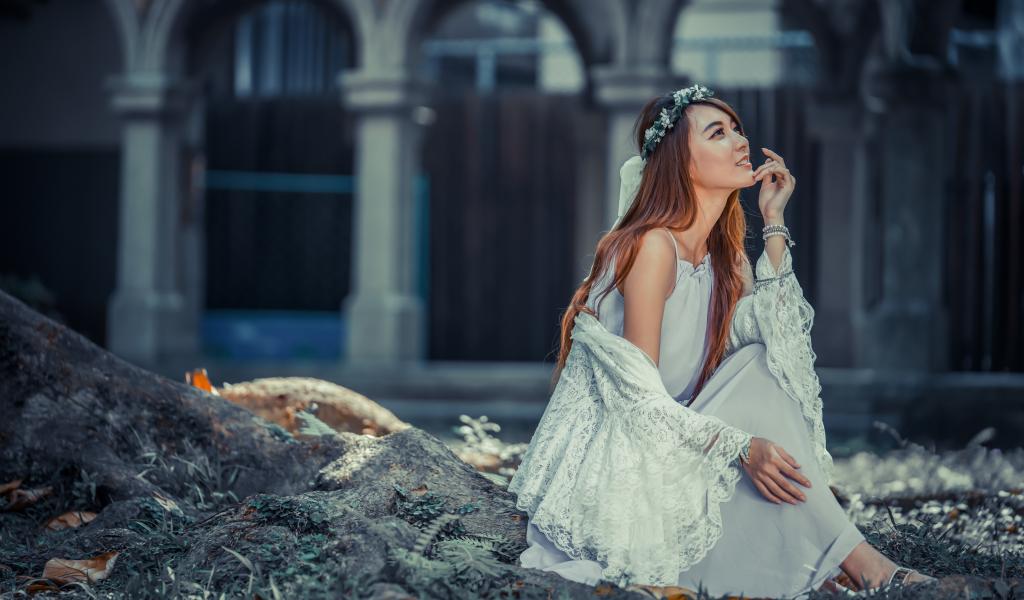 Обои Мечтательная девушка азиатка в белом платье