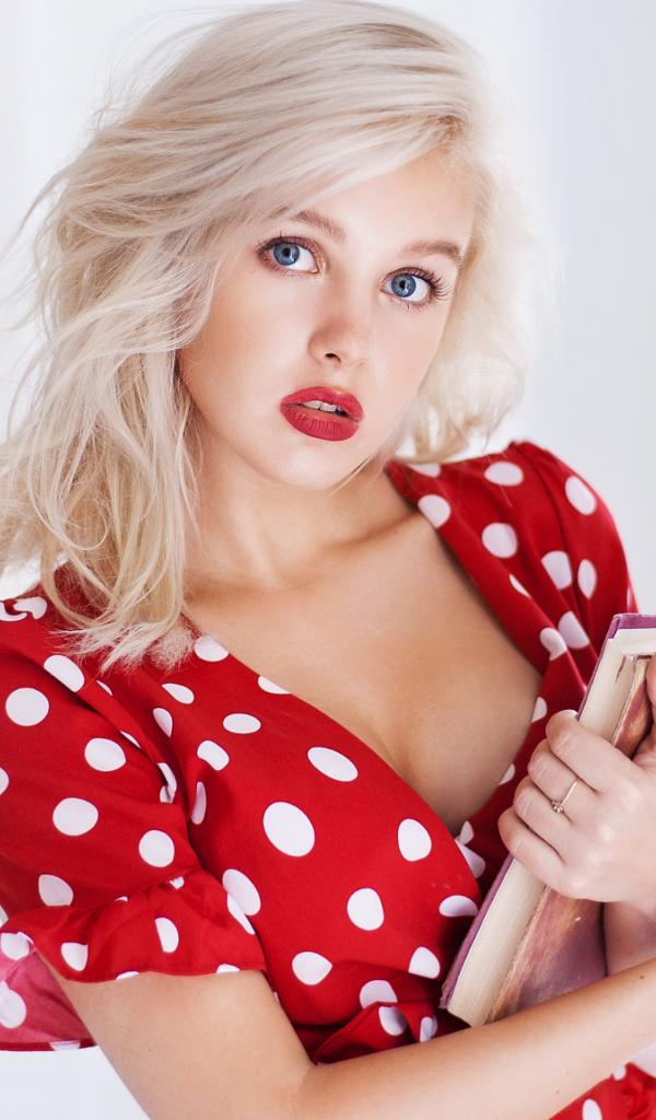 Обои Голубоглазая блондинка в красном платье с книгой в руке