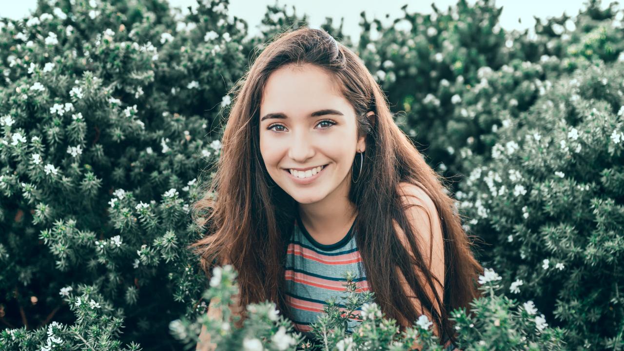 Обои Улыбающаяся девушка сидит в зеленых зарослях