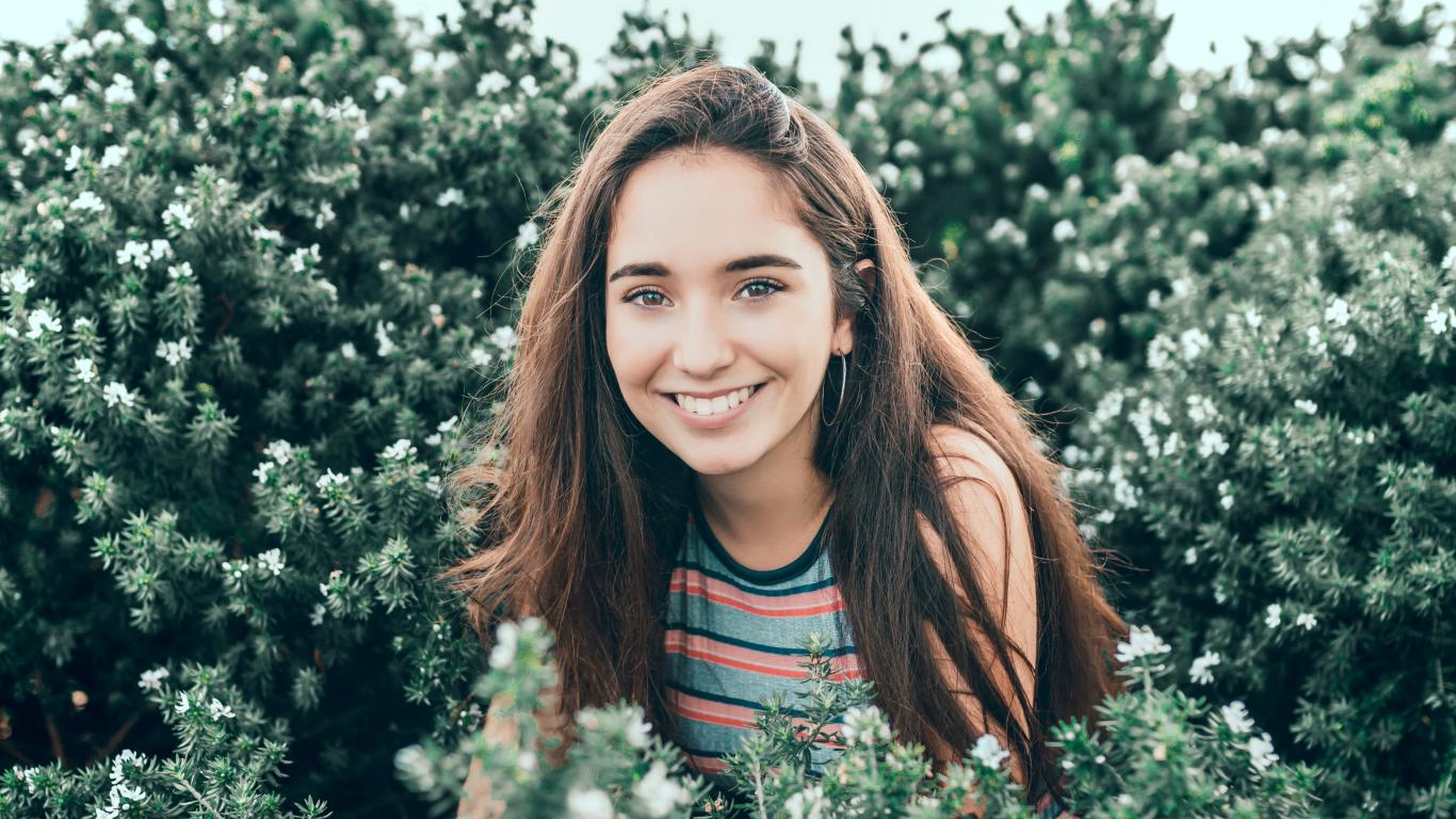 Обои Улыбающаяся девушка сидит в зеленых зарослях