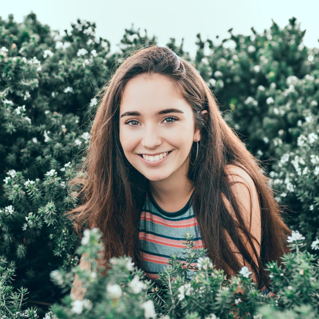 Обои Улыбающаяся девушка сидит в зеленых зарослях