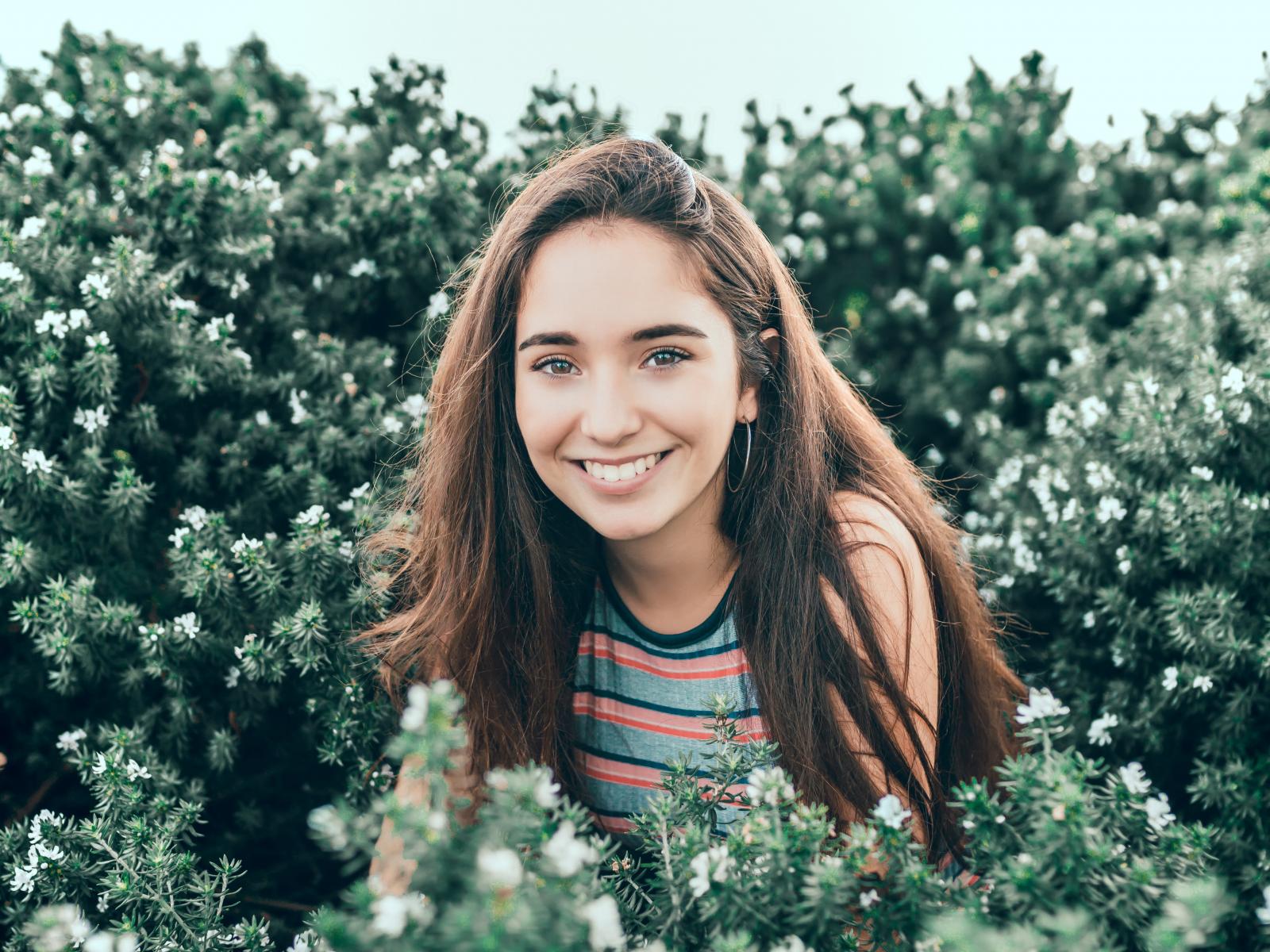 Обои Улыбающаяся девушка сидит в зеленых зарослях