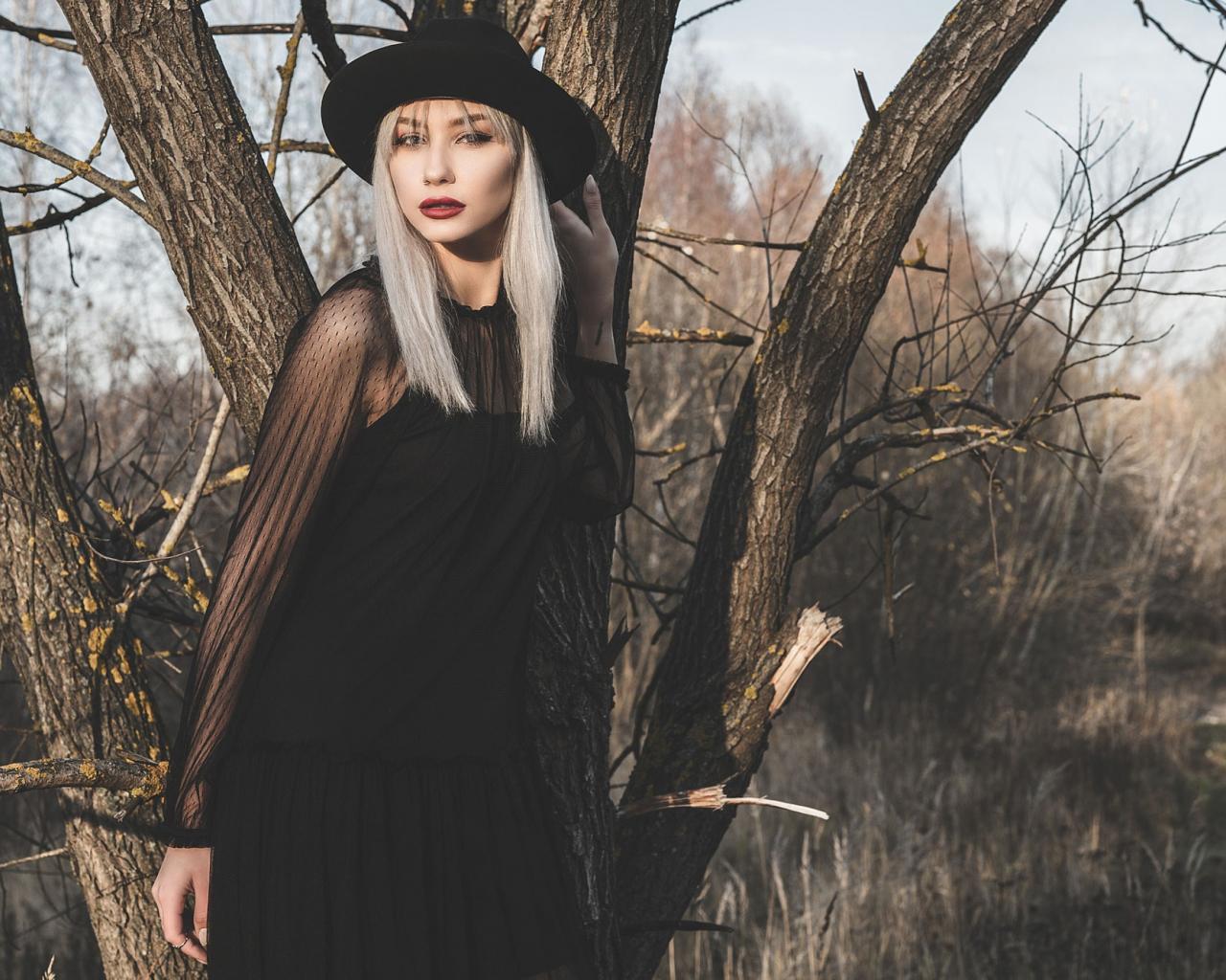 Обои Молодая блондинка в черной шляпе у дерева