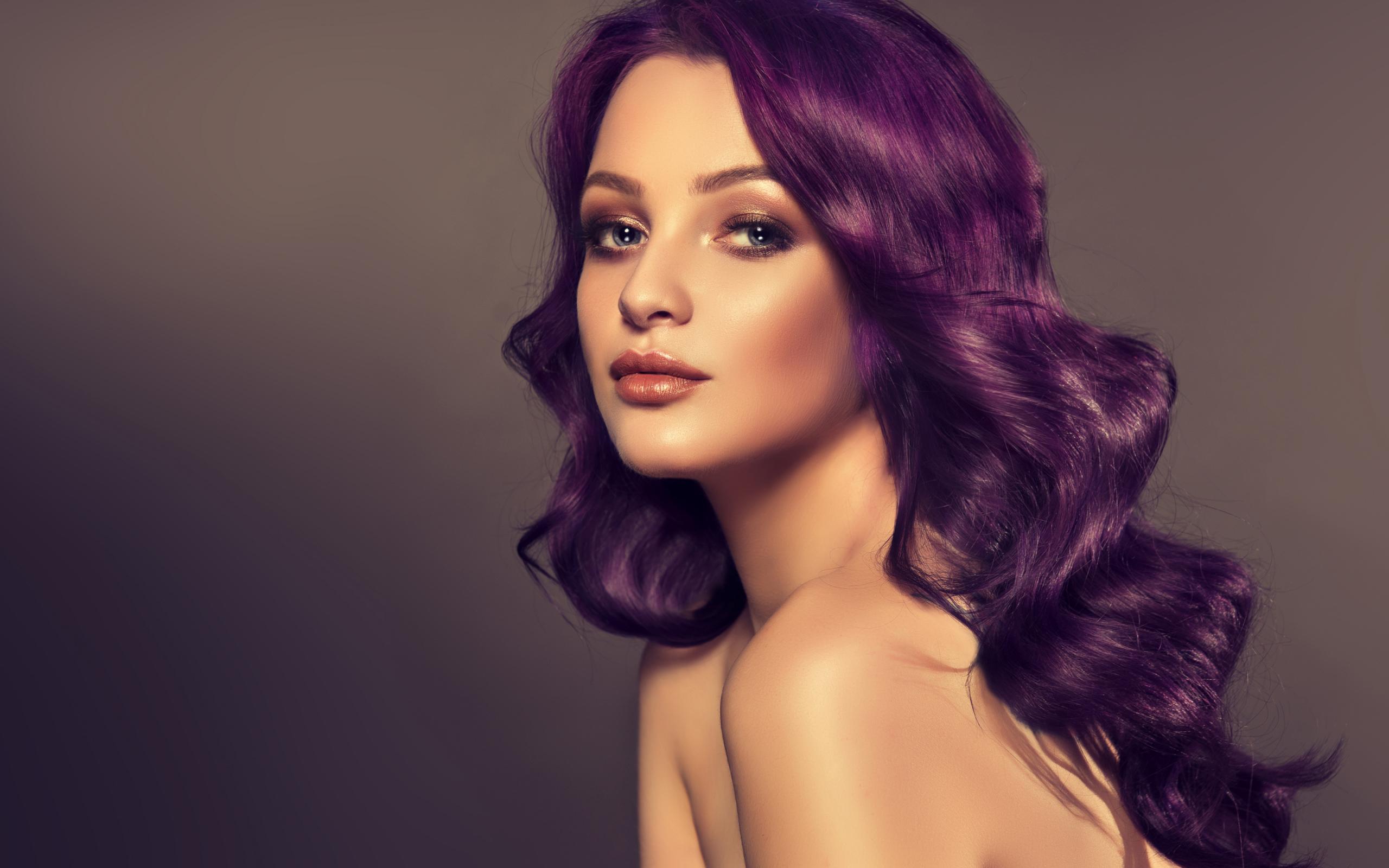Обои Девушка с фиолетовыми волосами на сером фоне