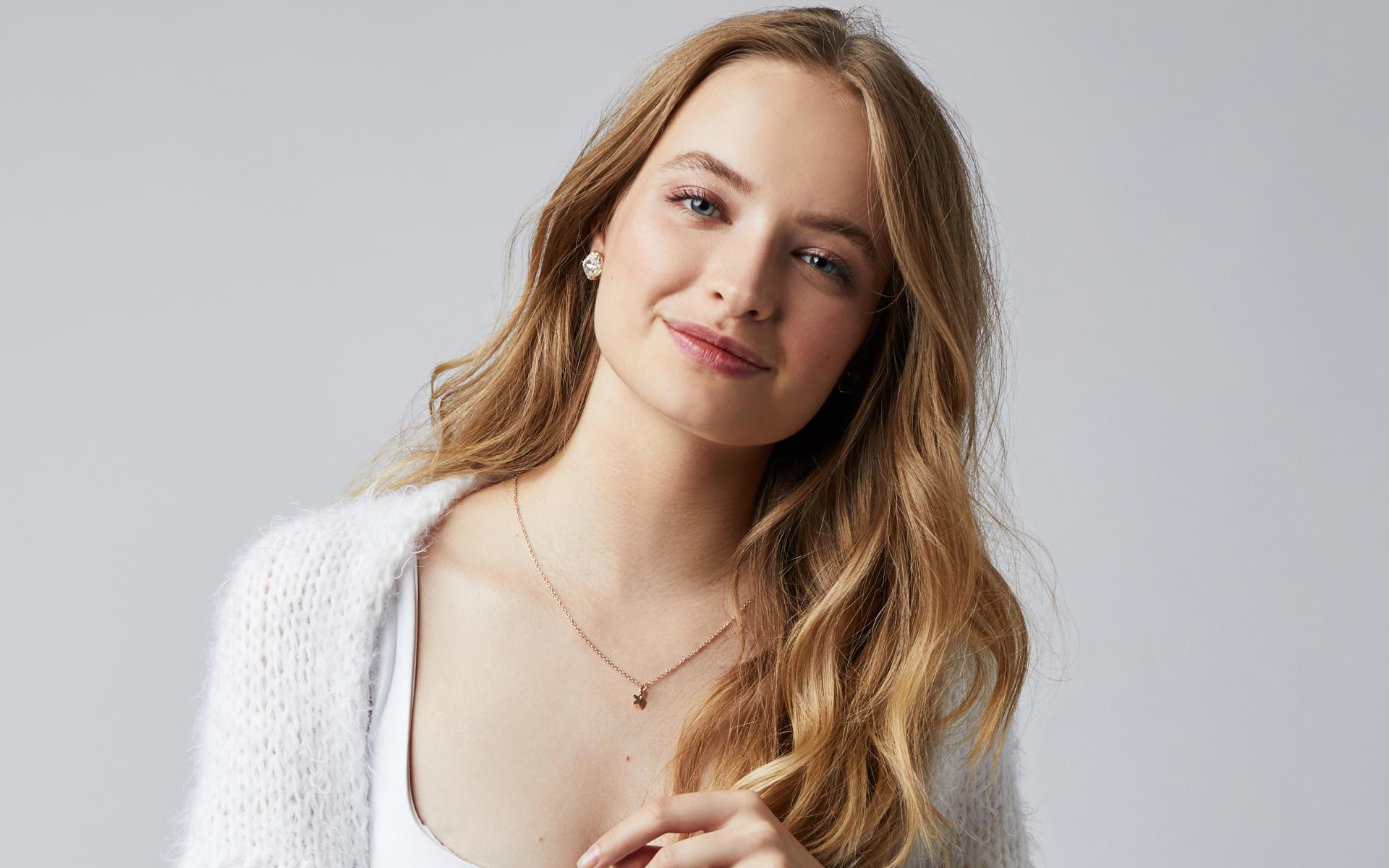 Обои Нежная улыбающаяся голубоглазая девушка на сером фоне